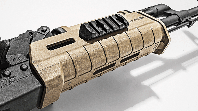 Compliance is enhanced with an American-made forend and pistol grip from Magpul. Magpul’s MOE AKM Hand Guard, rail cover and pistol grip are comfortable and effective drop-in replacements for stamped-receiver AK variants. Magpul handguards easily accommodate accessories with M-LOK attachments. A short piece (five slots) of anodized aluminum rail was also attached to the forend, and I bolted on a Crimson Trace Rail Master Pro unit with an integral light and laser. One 30-round Magpul PMAG accompanies the AK-T.