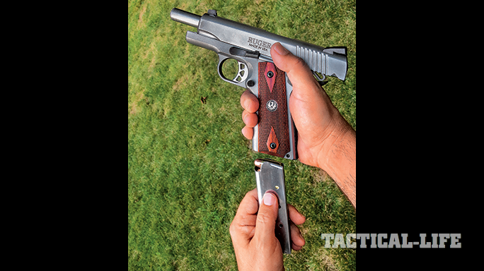 Elsewhere, the CMD’s barrel is CNC-machined from bar stock in-house with broached rifling. The firing pin is titanium to allow the pistol to pass various drop test requirements without resorting to an internal passive firing-pin block, which the CMD does not have. The included stainless magazines are made for Ruger by Checkmate, a well-known American supplier to several 1911 brands. Finally, the traditional diamond-pattern checkered grip panels are made by Altamont.