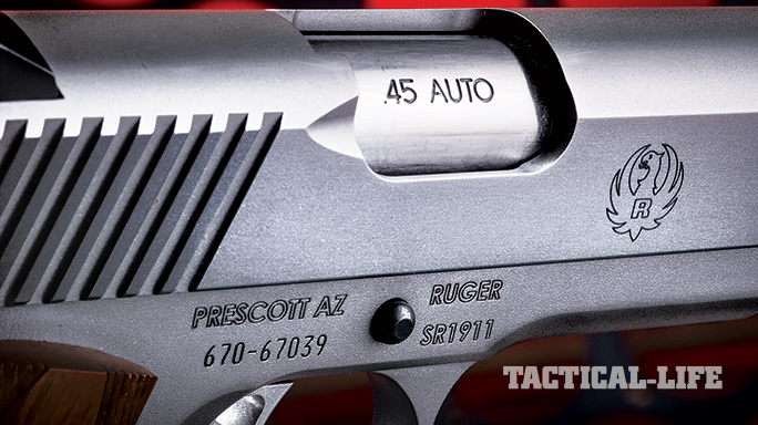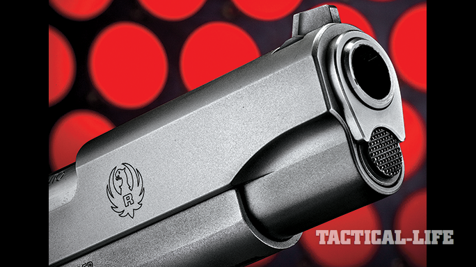 A closer look shows excellent machining—none of the razor-sharp edges that I paid extra to have removed on some other 1911s. The CMD has a uniform finish, with lines that are straight where they’re supposed to be straight and curved where they’re not. The slide’s rear doesn’t overhang the frame’s rear, there’s no excessive vertical trigger movement, the thumb safety snicks on and off positively (but not too positively), and there is no hole in the frame around the rear of the thumb safety, as found on some other 1911s, that can collect dust. The frame-to-slide-fit is relatively tight without being too tight; my sample’s barrel was correctly fitted, with no downward play under thumb pressure through the ejection port; the hammer shows a distinct absence of rub marks on either side from contact with the slide during cycling; the dust cover walls are uniform and not thinner on one side than the other; and the rear of the extractor is almost perfectly flush and not clocked at the rear of the slide. These are all key external inspection points for me with new 1911s as indicators of how much attention a given maker pays to details in overall quality, and the new Ruger gets a high rating in those areas.