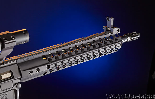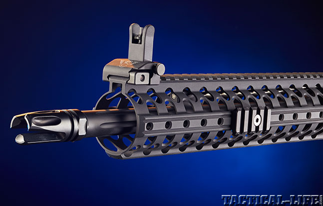 The rail features threaded holes along the nine, three, and six o’clock positions that allow the user to install Picatinny rail panels as needed. Ample cooling holes reduce weight and increase airflow around the barrel. My test rifle also came equipped with Wilson’s flip-up sights. The front sight is spring loaded and raised by depressing the activation button on the side. The front sight tower has a standard post and A2 wings while the rear sight features the CSAT aperture designed by Paul Howe.