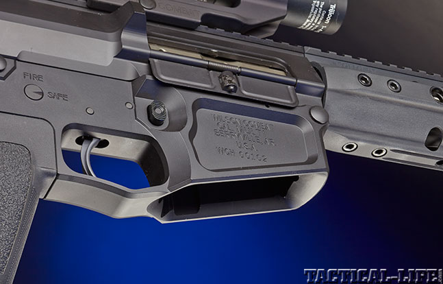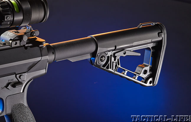 The new 7.62mm carbine utilizes Wilson’s BILLet-AR receivers, machined in-house from 7075-T6 aluminum for a lightweight design without compromising strength. The lower receiver features recesses on both sides of the magazine well that reduce weight while providing a raised guard around the magazine release and bolt stop. As with all Wilson Combat BILLet lowers, the 7.62mm receiver features a flared magazine well and an integral triggerguard. My test rifle was equipped with a Wilson Combat Tactical Trigger Unit (TTU) that broke cleanly at 3.63 pounds with minimal overtravel. A Bravo Company Gunfighter pistol grip provided a comfortable purchase on the rifle. The BILLet-AR Lightweight comes with a Lancer magazine and accepts polymer or metal SR-25-pattern magazines. A Wilson/Rogers Super-Stoc is standard on all Wilson ARs. The Super-Stoc features a cam-lock system that locks the buttstock and removes any play.