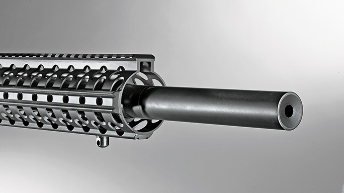Precision targeting demands accuracy, and the Super Sniper has a number of features that promote good bullet placement. They begin with the rifle’s match-grade Wilson barrel. My test rifle featured an unfluted bull barrel that was button rifled with a 1-in-10-inch twist rate, which is ideal for stabilizing the heavier and more aerodynamic 175-grain match bullets that are popular with snipers. The barrel is made of 416 stainless steel and it has a target-style reverse crown. Put these features together and you have a stiff barrel that dampens vibrations, resists heat warp, has match-grade rifling and sports a crown that cleanly releases each and every bullet.