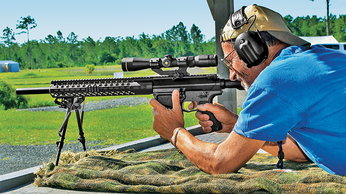 I field-stripped the Super Sniper and closely examined its overall exterior and interior fit and finish. The exterior was flawless. The green/gray Armor-Tuff finish on the barrel and receiver was evenly applied and complemented the matte black of the rifle’s furniture. There were no poorly conformed lines, sharp edges, scratches, burrs, tool marks or other exterior flaws in workmanship. When I disassembled the rifle for cleaning, the interior surfaces were also free of any defects. The rifle’s high degree of quality was also reflected in how it handled. All of the controls operated smoothly. When the bolt was released, it moved smoothly forward and locked up with a solid sound, and there was no annoying clang from the buffer tube spring when the bolt drove home. The charging handle glided back and forth, cocking the action with moderate effort. This definitely is not a rifle requires its operator to wrestle with its controls when it’s run from the prone position.