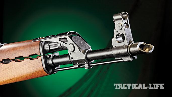 Other unique enhancements of the design include a top cover-retaining button that helps keep the cover in place under the heavy recoil of firing rifle grenades. A push button located at the upper left-rear portion of the receiver must be pressed to remove the non-ribbed top cover. Another unique feature of the Yugo rifles is its sighting system, which at first blush appears to be a standard AK design with a sliding tangent rear unit marked out to 1,000 meters and a winged post front. Closer inspection reveals folding leaf units with luminous inserts—two inserts on the rear leaf and a single on the front. They can be folded down and out of the way when not needed.