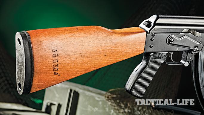 Externally, Yugo AKs differ from their Soviet counterparts in several ways. They feature lengthened, three-slot handguards, the aforementioned folding ladder sights atop the handguard, more generously sized pistol grips and rubber buttpads on the fixed buttstocks. Also unique to the Yugo design is an interestingly simple solution to the lack of a bolt hold-open on the standard AK—a magazine with a follower that catches the bolt of the rifle in the open position when it runs empty. However, there is no internal catch inside this Yugoslav rifle and the bolt will simply slam closed when the magazine is removed.