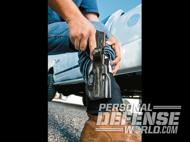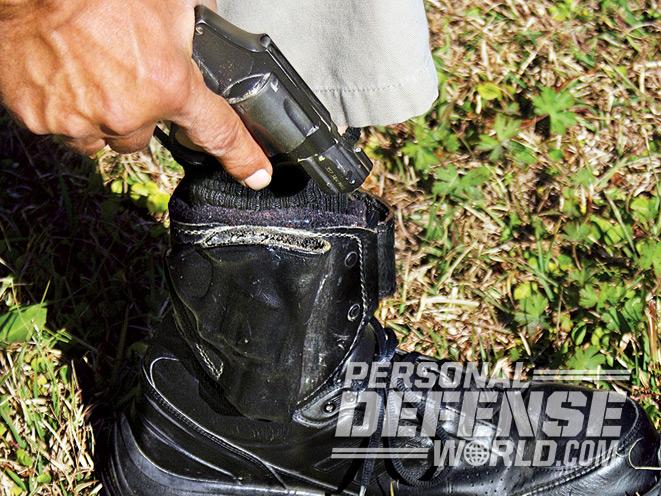 If you’ve ever worn an ankle holster for any length of time, you know how quickly it gets covered with a fine layer of dust and grit. You see the same, to a lesser extent, with pocket carry. Many small, finely fitted autoloaders do not tolerate that dusty environment well, and can jam once the shooting starts if not cleaned very frequently. This does not seem to occur with quality double-action revolvers. In fairness, some small semi-autos built to modern standards of reliability will survive the ankle holster environment, too—the baby Glocks, the little Kahr pistols and the Kel-Tec P-3AT and Ruger LCR come to mind. Generically, though, ankle carry still favors the revolver. With the gun tight against the calf that rounded grip frame comes into play again, and it can make the revolver slightly faster to clear. Note that gun expert Tom Givens, who carries a sixteen-shot Glock 35 in .40 inside the waistband as his primary concealed sidearm, prefers a 2-inch-barreled Colt .38 Special revolver as the backup in his ankle holster.