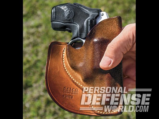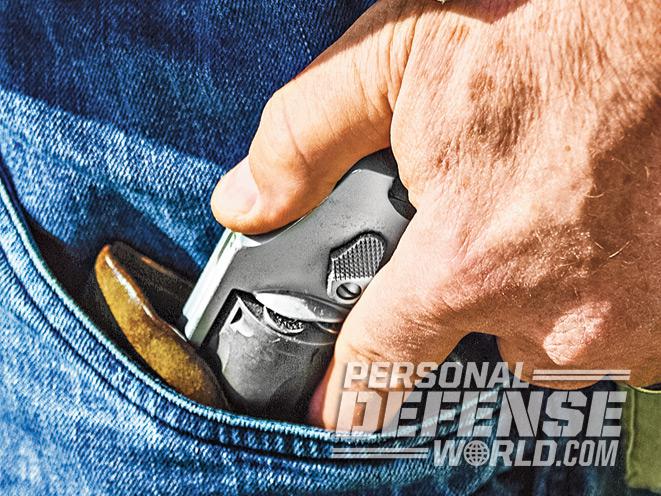 The other element is the shape of the part of the pocket-carried handgun that sits above the web of the shooter’s hand. A striker-fired semi-auto has most of the rear of its slide located there, but in a revolver that doesn’t have a hammer spur, there’s nothing there to snag in a pocket and slow down the draw.