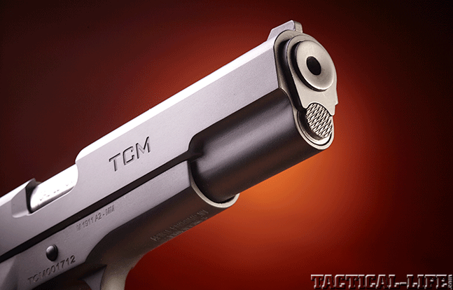and slide are made on CNC machines from 4140 chrome-moly steel. The .22 TCM 1911 tips the scales at 41.6 ounces unloaded. It has an extended beavertail, a Commander-style hammer and a skeletonized trigger. The Novak-style rear sight is fully adjustable, and the sighting notch is bracketed by a pair of eye-catching white dots. The front blade is 0.18 inches wide. The top of the slide is flattened, and both the frame and slide wear a Parkerized finish.