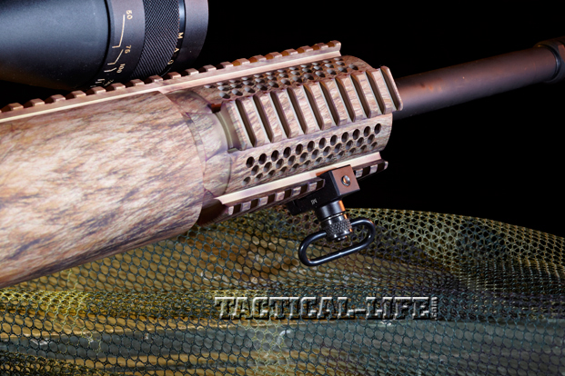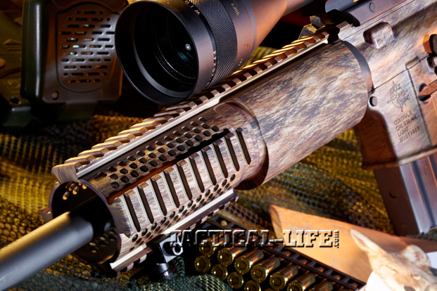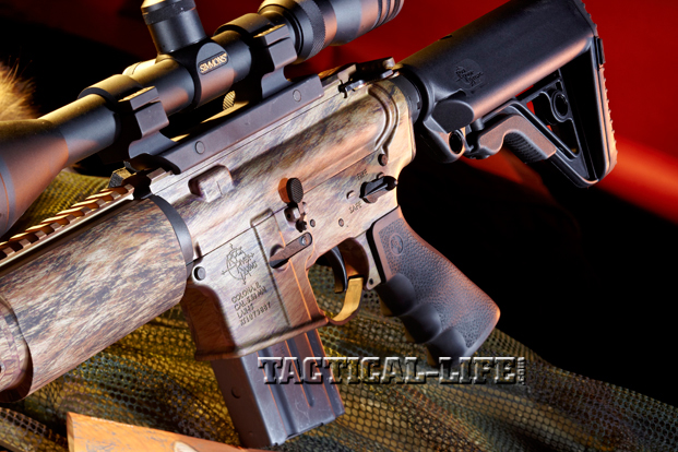 The Rock River Arms LAR-15 Hunter is a carbine-sized, AR-15-style rifle chambered in 5.56mm NATO, and its most distinctive feature is a new anodized finish called Ehide camouflage, which matches the actual hides from either a coyote (“WYL-Ehide” camo) or a wild boar (“PRK-Ehide” camo). Ehide finishes are exact copies of photos of the hides of these two animals, but the finish is applied using hardcoat anodizing instead of film dip, paint-on appliqué or spray-on technology. Hardcoat anodizing is far more durable than those other finishes. RRA explains that any high-resolution photo can be used to create a custom anodized finish. Ehide finishing is done by an outside firm that uses a proprietary process. Though RRA does not plan to offer this service on customer-supplied photos, I imagine some shooters would pay the additional cost of at least $420 (the approximate upcharge on an RRA rifle for the Ehide finish) to get their pattern applied.