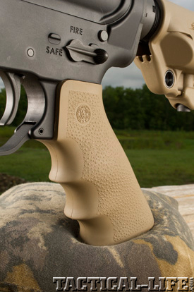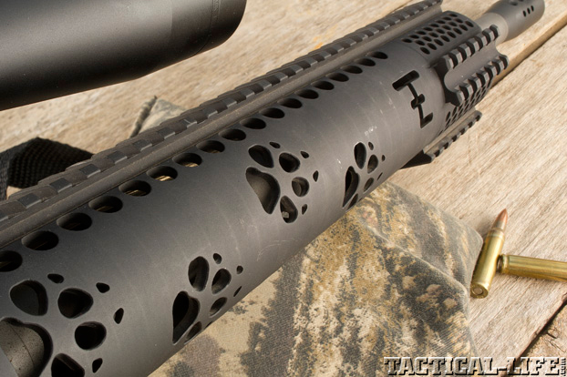 This rifle wears a RRA free-floating handguard that has a full-length Picatinny top rail and 2.5-inch rails at 3, 6 and 9 o’clock for mounting lights, lasers and bipods. These rail sections aren’t just bolted to the handguard: they’re machined as part of the whole unit. The handguard also displays a unique CNC-machined coyote-track design, which adds both flare and functionality by dissipating heat.