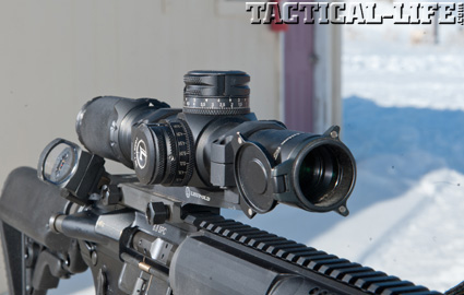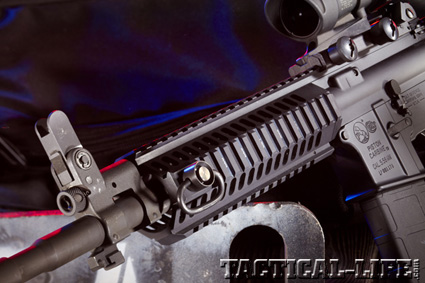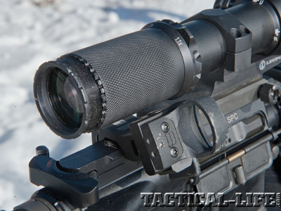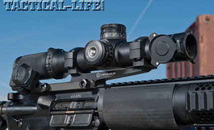 For testing purposes I attached a Leupold Mark 8 1.1-8x24mm CQBSS M5B1 scope using the Leupold Mark 8 IMS 34mm mounting system. The Mark 8 scope provides a true 1.1x low range with a crystal clear 8x at the top. A TMR reticle is located in the first focal plane and is illuminated. The 24mm objective keeps things slim, making it perfect for the AR platform. A large knurled ocular lens provides for fast power-adjustment under any condition. Pinch-and-turn knobs graduated in mils make for solid adjustments. To round out the sighting system I mounted a Leupold DeltaPoint reflex sight on the 1 o’clock rail. This micro-dot allows for fast CQB work with a triangle that allows for precision beyond a simple dot.