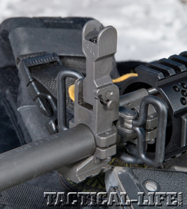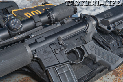 The build starts with an RRA LAR-6.8 CAR A4 rifle with a Tactical CAR stock and a chrome-moly, 16-inch barrel with a 1-in-10-inch twist rate and a Smith Vortex flash suppressor (chrome-lining of the barrel is available). RRA’s Advanced Half Quad free-floated handguard—one of my favorite designs—covers the barrel. A smooth portion of the handguard, close to the receiver, allows for comfortable handholds, especially in unsupported positions. Short quad-rails up front allow for a light and even a bipod. The long top rail accommodates night vision or lasers. I also had RRA’s flip-up front sight added, which offers a clear sight picture with optics; serves as a solid, dependable back-up iron sight; and adds a small rail perfectly suited for light attachment and sling swivels on both sides and the bottom.