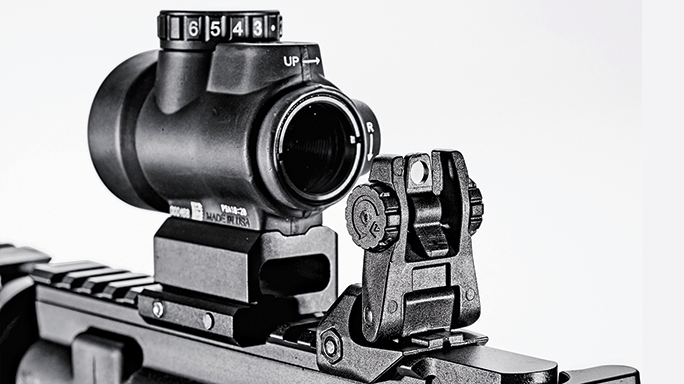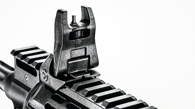 The NSP has plenty of places to mount a wide variety of accessories. This versatility allowed me to move the front sight back a few notches on the handguard’s upper rail so I could put an Insight Procyon light on top of the gas block. Mounting the light on the gas block minimizes the offset between the lines of the bore, light and sights. The gas block’s top rail is a good place for a light or light/laser combination—provided that the rifle’s iron or optical sights are mounted high enough so that the light does not unduly compromise the sight’s field of view. The folding sights are useful as they can be used as backups if the scope is damaged and removed. However, it is important to re-zero the iron sights if they are removed from the rifle and then replaced to ensure accuracy.