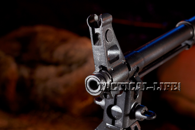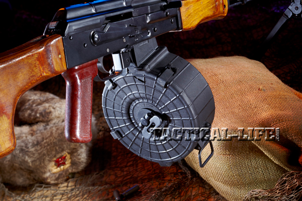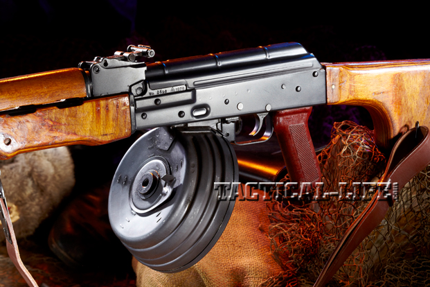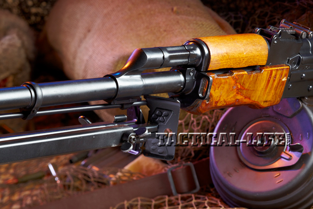 Although it employs a stamped sheet-steel receiver like the AKM, the RPK’s receiver is thickened and reinforced around the forward portion, around an enlarged trunnion. Additionally, the rear sight is upgraded to feature windage adjustments. While the RPK accepts standard AK-pattern magazines, it is primarily fed by either increased-capacity 40-round magazines or 75-round drums.