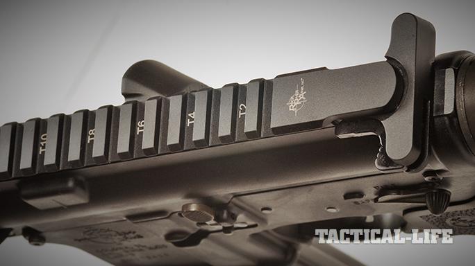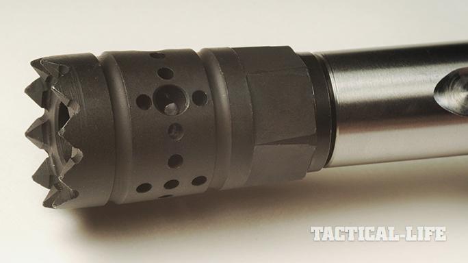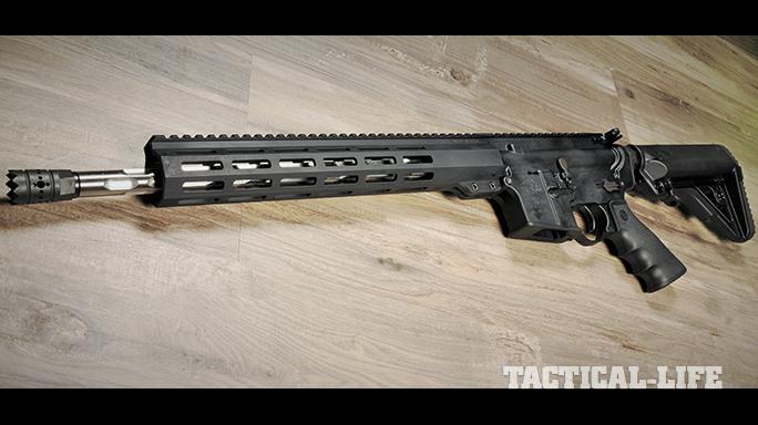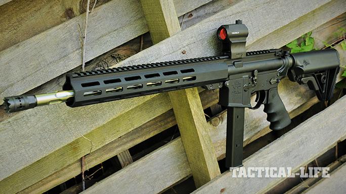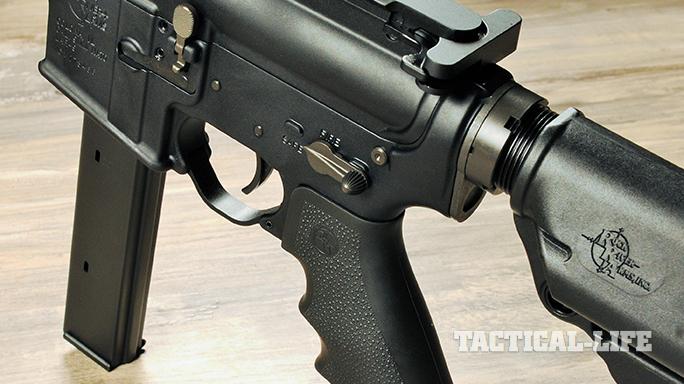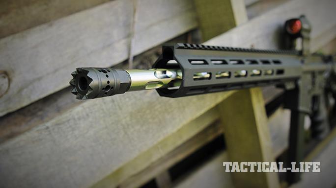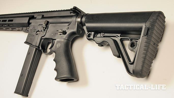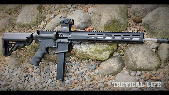 The first two items on this carbine to grab my attention were the 16-inch, free-floating barrel with chain-link fluting and the aggressive-looking 9mm Mini-Brake. Picking up the carbine, it had a similar heft and all of the controls of a typical AR-platform rifle. The safety selector was very positive and slightly oversized—perfect for competitions and those stressful home-defense situations.