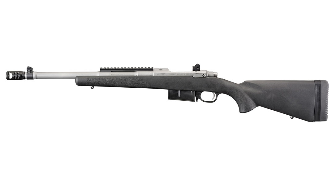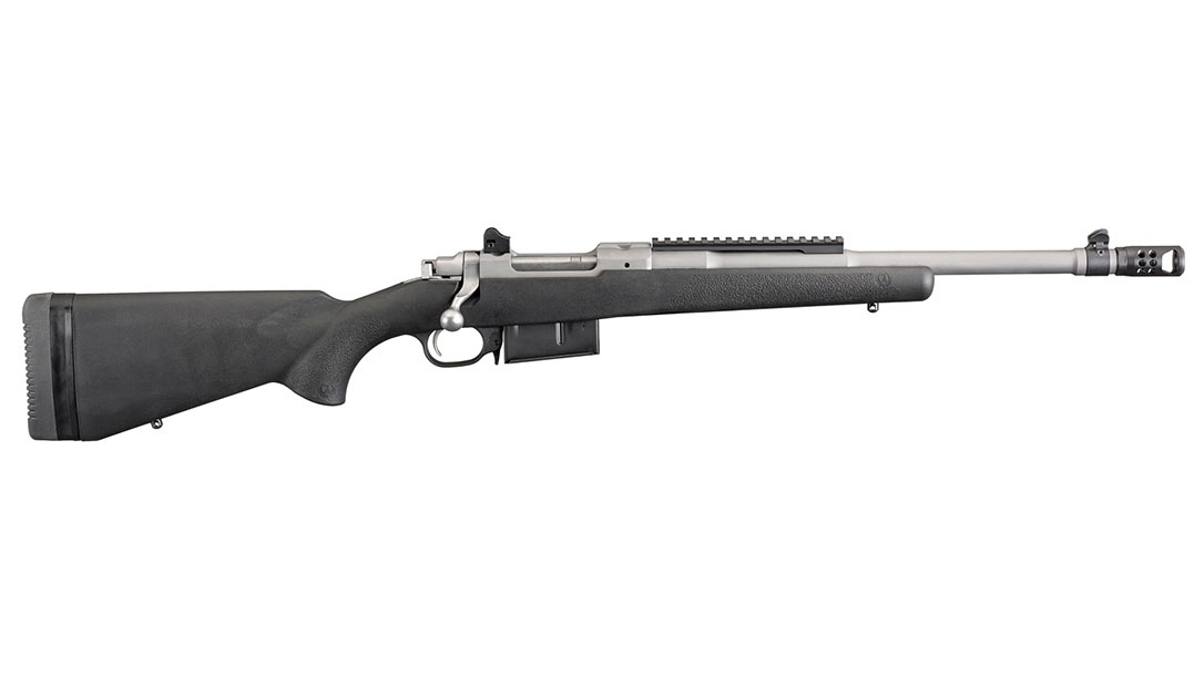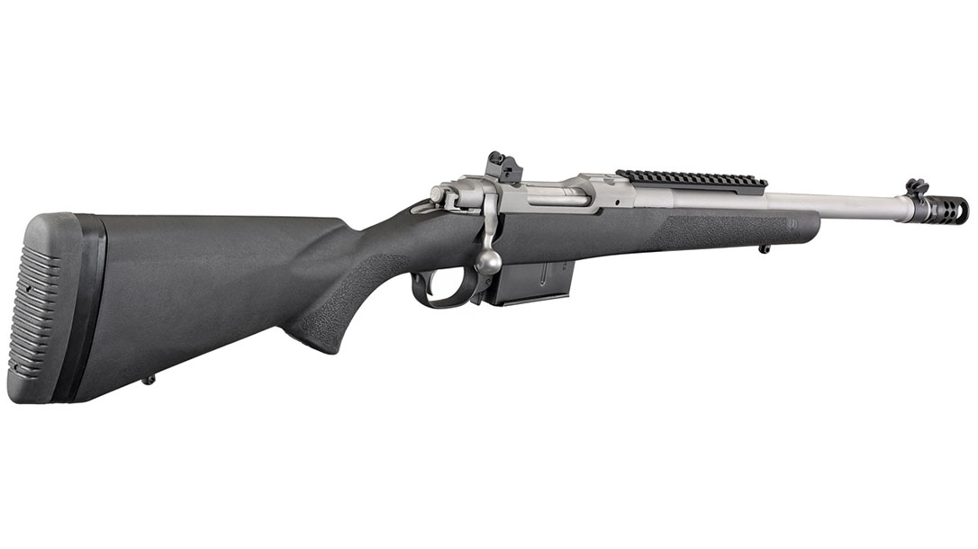 Introduced at the behest of hunters, the Ruger Scout Rifle in .450 Bushmaster sports a stainless steel finish; lightweight synthetic stock; 16.10-inch free-floated, cold hammer-forged barrel with a Ruger Precision Rifle hybrid muzzle brake; non-glare, protected blade front sight and ghost ring adjustable rear aperture sight; 4-round, detachable box magazine; glass-reinforced nylon trigger guard and magazine well; one-piece, stainless steel bolt; three-position safety; sling swivel studs; and a forward-mounted Picatinny rail.