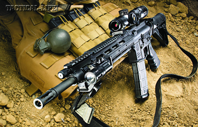As well dressed as the SR-556 Carbine comes from the factory, it was not quite what I would want to hit the streets with. First, the gun needed a top-of-the-line optic, and I needn’t look any further than Leupold. Since I viewed this gun for patrol or SWAT operations, I felt having an optic that would work in close quarters but also “reach out” and see what a suspect is holding in their hands would be the way to go. Leupold’s VX-R Patrol optic is a 1.25-4x20mm scope packed full of features. Its FireDot Special Purpose Reticle, once activated, illuminates a dot at the center of the crosshairs with bright, sharp definition while the rest of the reticle is not illuminated. This combination leads your eye naturally to the center aiming point and makes target acquisition quick, precise and simple regardless of the distance involved. Leupold’s Index Matched Lens System has nearly perfected superior light management by utilizing different coating materials for each lens surface in the riflescope, based on the lens’ index of refraction, placement and function, layering each coating to eliminate reflections and maximize light transmission. The result is unparalleled brightness and extremely sharp resolution across the entire visual plain. Leupold’s DiamondCoat on the exterior lenses gives the ultimate in abrasion resistance and light transmission. The result is a flawless sight picture over a career of hard use.