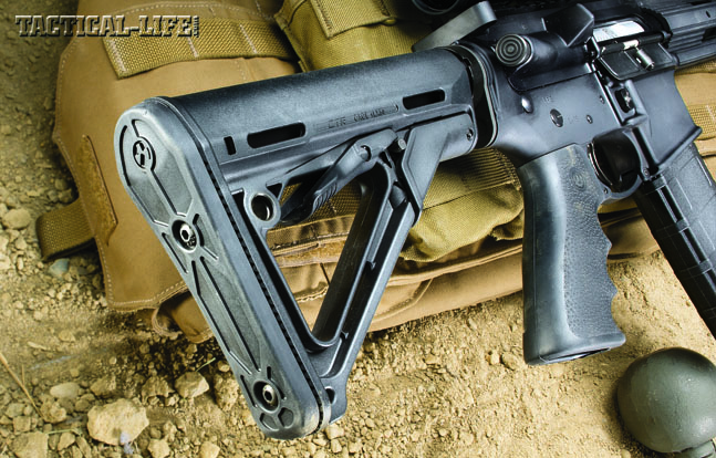 As for accessories, while I could go from manufacturer to manufacturer to get what I needed, I could also find one source for everything. Simplicity being key, I opted for the latter and contacted Bob Meszaros at Templar Custom Arms. Templar is a custom gunsmith service that not only combat-modifies polymer-frame pistols but also builds custom AR platforms from the ground up, including machining the upper and lower receivers! Templar offers AR-15s to customer specifications as well as a wide variety of accessories—it had exactly what I wanted. While the Ruger factory rear stock is usable, it is not optimal. So I had an adjustable Magpul CTR (Compact/Type Restricted) rear stock attached, a drop-in replacement buttstock using a mil-spec-sized receiver extension tube. The streamlined A-frame profile avoids snagging and shields the release latch to prevent accidental activation. The CTR also features a supplemental friction lock system, which minimizes excessive stock movement for enhanced weapon stability, and an ambidextrous QD sling mount, which will accept any push-button sling swivel. The CTR is sleek and large enough to offer a solid cheekweld. Truth is, there is no better buttstock on the market.
