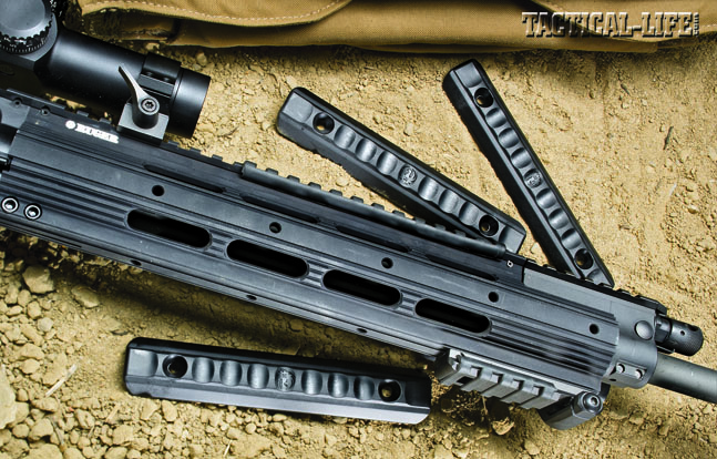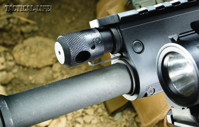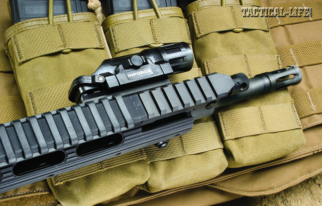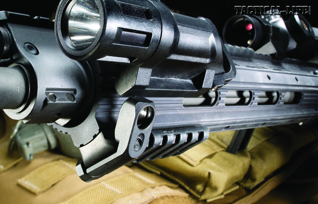 A long gun needs also a white light on the forend to identify threats and keep the support hand available for shooting. For the last few months I have been using the Inforce WML with a momentary activation feature. This simple-to-use weapon light is designed just for those who prefer the single-mode function of a more traditional-type switch. The Inforce WML produces 200 lumens of white light for two hours, with a tight beam for close- to mid-range use and balanced peripheral light for identification of the surrounding area. The WML uses an angled activation button that facilitates operation without interference from wires or tape switches, a feature that I find to be quite appealing and easy to use. The integrated rail clamping system is compact, convenient and secure. And two distinct lockout systems are incorporated to avoid accidental discharges. My final addition was a sling, as I view a sling as the holster for a long gun. My favorite sling is the Larry Vickers–designed two-point Vickers Combat Applications Sling from Blue Force Gear. Being able to quickly transition from carrying a slung rifle to being combat ready smoothly is critical, and the patent-pending Quick Adjuster tab used on the VCAS has bridged the gap between the two primary uses of a weapon sling: transportation and fighting. The VCAS is simply one of the easiest-to-use two-point sling.