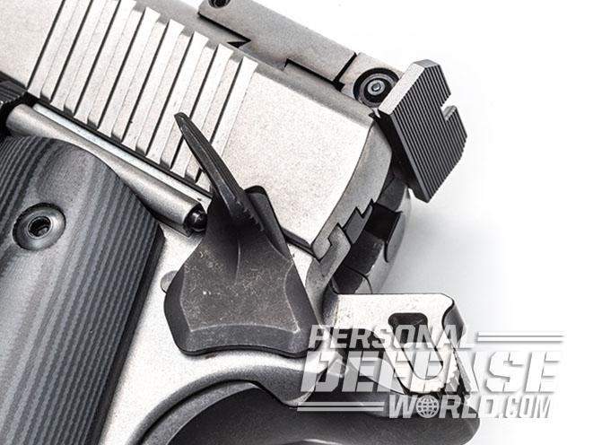 The hammer, sights, G10 grip panels, and controls—except for the trigger—are black for a nice contrast against the stainless steel slide and frame.