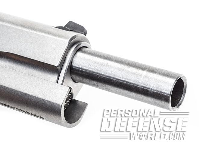 Another interesting element of the pistol’s design is the fact that the slide and bushing are machined from a single piece of bar stock. Ruger states that this enhances the pistol’s accuracy. It also has a swaged barrel link pin to help eliminate any play in the lower lockup as the barrel moves in and out of battery. This also helps the barrel return to the exact same position each time it cycles—another feature promoting inherent accuracy.