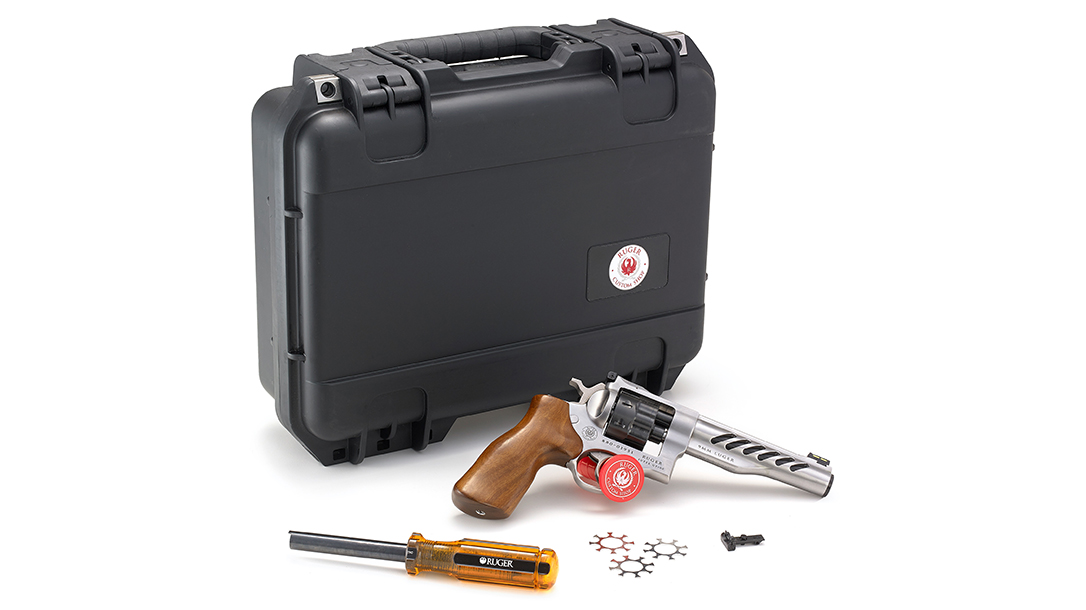 The revolver ships in a waterproof, fitted hard case and includes three moon clips and moon clip unloading tool. A Ruger Custom Shop Certificate of Authenticity, challenge coin, cleaning cloth, gun peg and decal round out the package.