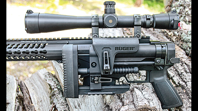 The rifle is not exclusively designed for shooting from prone or benchrest positions. The forend handles bipods or sandbags with aplomb. The stock allows for off-hand and other types of supported fire if needed. Think field-expedient positions like shooting from the trunk or hood of a squad car. The adjustable Ruger MSR buttstock offers a comfortable, repeatable cheekweld. This combines with an AR-style pistol grip that makes it much easier to pull the Ruger Marksman trigger smoothly to the rear every time.