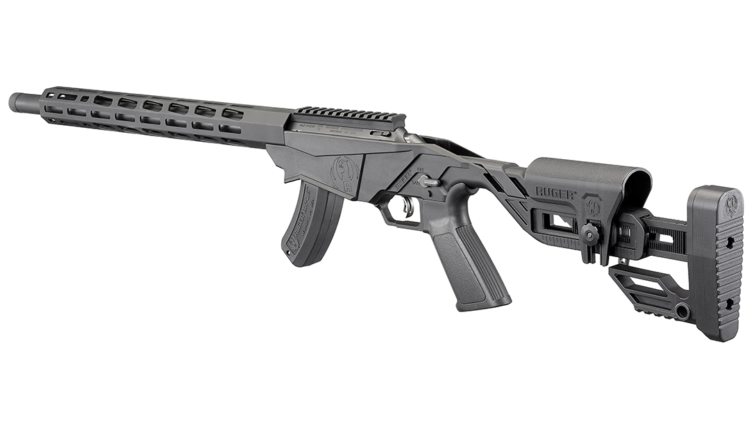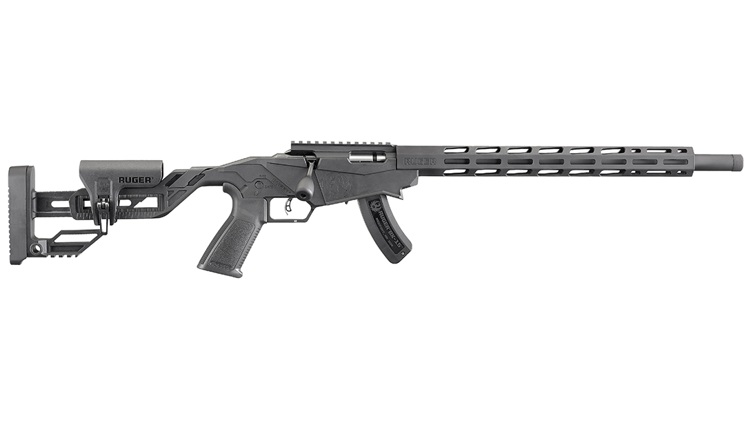 With the Precision Rimfire, you can adjust the bolt throw; it can be short—just long enough to eject an empty casing and chamber a new one—or the same 3-inch bolt travel as its centerfire counterpart. The bolt handle itself has a big knob just like the centerfire model’s. Ruger uses a free-floating M-LOK handguard, and the hammer-forged, 18-inch barrel sports a match chamber and muzzle threading. And, realizing that competitors may want to upgrade their barrel at some point, Ruger engineers designed the barrel to be replaceable. The receiver also features a 30-MOA top rail, and the chassis is molded from rigid glass-filled nylon.