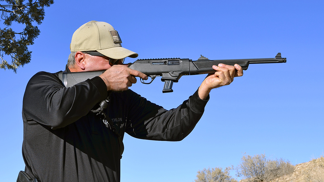 The new carbine is blowback operated and uses what Ruger calls a “dead blow” action. A tungsten weight, nearly as heavy as the bolt itself, floats freely in the bolt assembly, essentially reducing the length of the bolt stroke and greatly reducing felt recoil and muzzle lift. The bolt’s charging handle can be changed to the left side if desired, and the magazine release is also reversible, making the PC Carbine southpaw friendly.