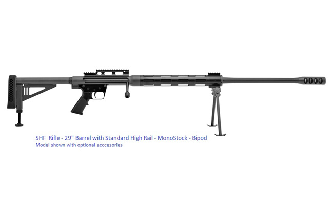 The Safety Harbor Firearms SHF S50 Rifle, chambered in .50 BMG, features a 4140 Chrome moly steel barrel in 18, 22 and 29-inch variants with a twist rate of 1:15. It also includes an aluminum scope mount with a Picatinny rail profile mounted on the receiver. The SHF S50 has a standard steel buttstock, which can be upgraded to a Mono Stock for an additional $50. In addition, this rifle has a bolt body/head and receiver which were precision machined from 4130 Chrome moly Steel. Overall weight is 15.5 pounds (18 inch barrel), 16.5 pounds (22 inch barrel), and 19.0 pounds (29 inch barrel). Production lead time on these rifles runs approximately ten to twelve weeks or more. Manufacturer suggested retail price for the Safety Harbor Firearms SHF S50 Rifle is $1,950. See below for additional details.