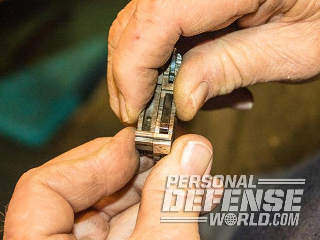 Then he went to work on it. “I did my deluxe action, where I line everything up, smooth sharp edges and radius the edges on the inside of the hammer, trigger and rebound slide,” Denny said. “Then I polished those parts to a mirror surface on the contact surfaces. That takes more time, which is why I charge more. Then I used the yoke stretcher to stretch the yoke to the proper length, and tightened it up. I measured the hand to ascertain its width, and put one in that was a thousandth larger, and fitted that, correcting the timing. I used my tool with a brass barrel liner to cut the forcing cone flat. I removed the trigger serrations, and radiused and polished the trigger surface. The same was done with the hammer.”