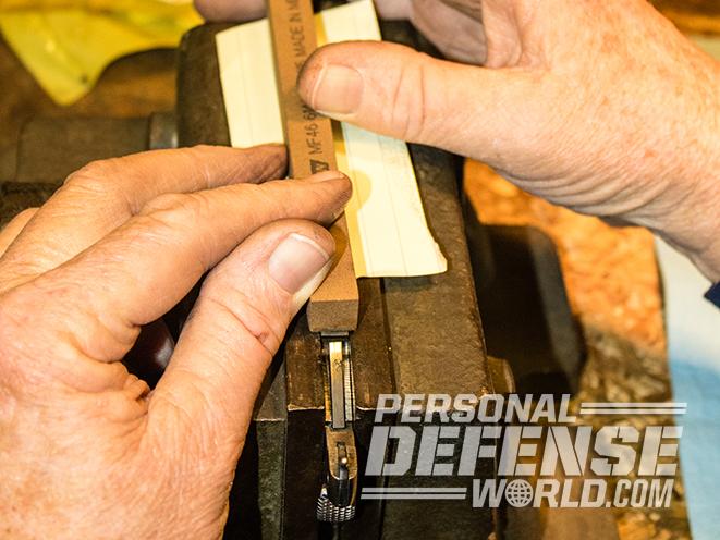 Denny’s approach to this is worth noting. He explained, “We set up the hammer in the mill vise that Ray Saltzman showed me how to use for this. We used an India stone and placed it on a double thickness of paper atop the mill vise with the stone traveling over the single-action sear portion of the hammer notch. We simply moved it back and forth until the notch was gone, and that area was smooth with the rest of the hammer surface.”