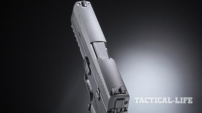 First introduced in January 2014, the Sig Sauer P320 boasts an insane level of modularity and a clean, crisp trigger pull. According to the press release, the serialized trigger group is interchangeable, enabling the shooter to change the size and caliber of the pistol. Available in full size, carry, compact and subcompact frames, the P320’s grip frames are also divided into small, medium and large to accommodate shooters of any hand size.
