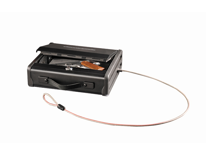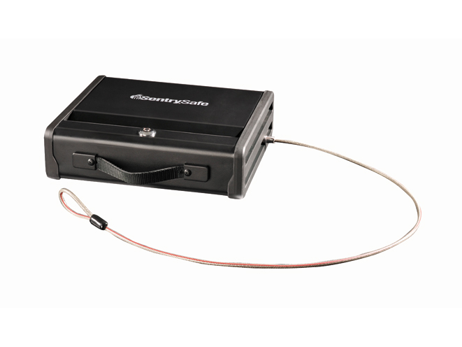 For travel use, SentrySafe also makes a smaller and more convenient Portable Pistol Safe that includes a carry handle and a steel security cable for attaching the safe to a solid object to prevent theft. This allows you to safely transport your firearm in a vehicle or for air travel in your checked luggage. The Portable Pistol Safe is key-lock operated and is also made from steel with a pry-resistant, top-opening lid and a padded interior.