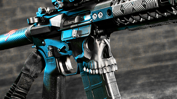 The Sharp Bros. Jack lower can best be described as a skull morphed into a magazine well. John boasts that the Jack was the most ambitious AR-15 lower design ever conceived. He started the design process by purchasing a set of tooth and gum models from a dental supply company. Once compiled in the 3D software, the lower prints for review. John finds that while the skull’s shapes are accurately parlayed onto the receiver, the details and proportions don’t translate well visually on the finished receiver. He spends endless hours reshaping, distorting and modifying proportions. He doesn’t stop until he gets the look he wants translated perfectly onto the AR. With the design finalized, over 3 million bits of code went into writing the machining instructions. John estimates that the Jack build required about 10 times as much code as other receivers.