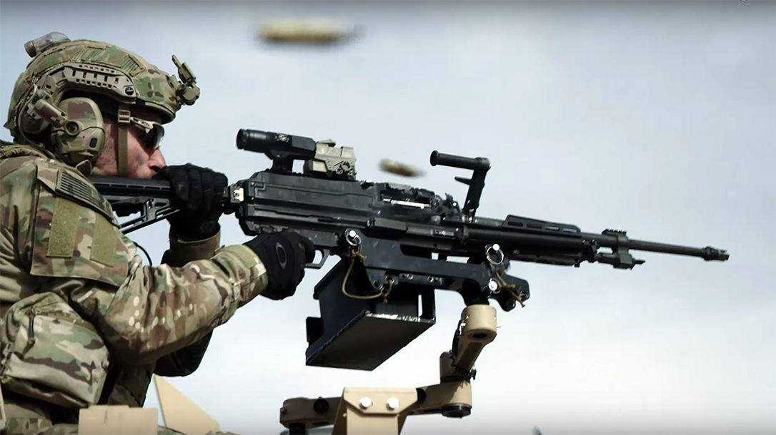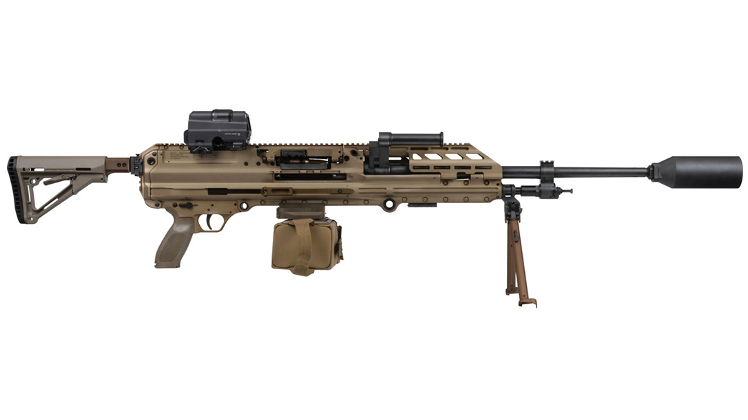 The MG 338 machine gun weighs less than 20 pounds. The belt-fed, lightweight medium machine gun design fires the 338 Norma Mag. SIG’s machine gun also features a short-stoke gas piston system and proprietary recoil mitigation system. It utilizes a free-floating, quick-change barrel, ambidextrous controls and a switchable feed tray. Meanwhile, the charging handle alternates to either side, depending on operator preference. The modern, multi-caliber, modular system also easily converts to 7.62×51.