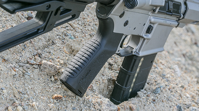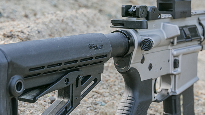 Sig has also designed its own furniture for this carbine. The M400 Elite features an enhanced pistol grip as well as a six-position-adjustable buttstock with left- and right-side QD sockets as well as three slots for mounting a loop/buckle-style sling. A rubber recoil pad ensures a positive mounting surface. The rubber pistol grip is textured on the sides with groves on the front- and backstraps for traction. A storage compartment is accessible from the bottom of the pistol grip. Finally, the M400 Elite is available with either a black or titanium finish. I chose the latter for my test rifle.