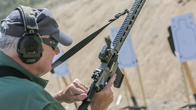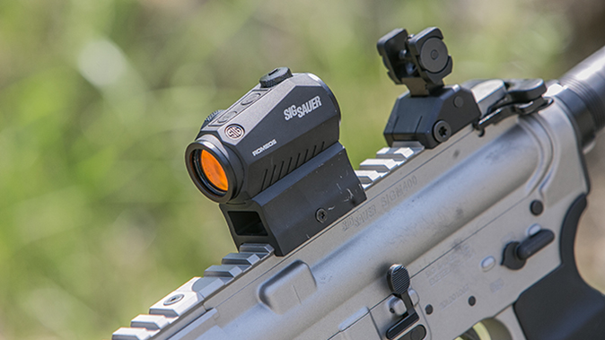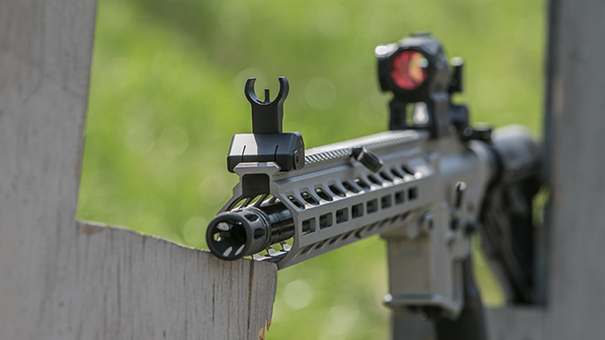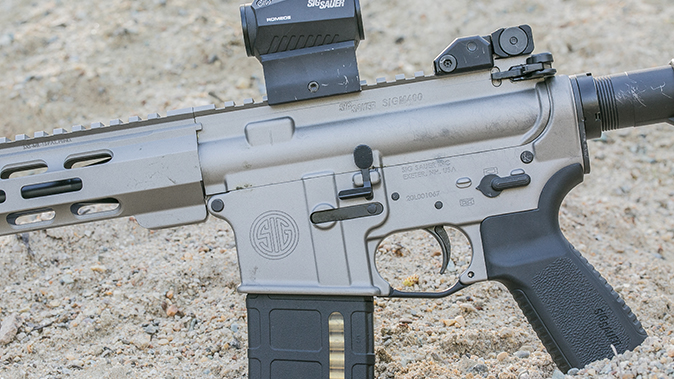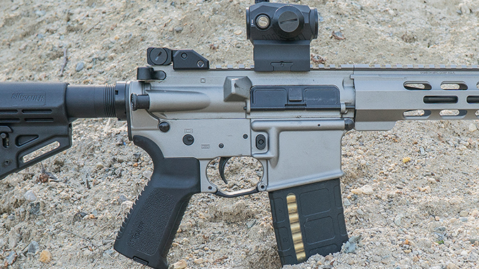 As mentioned, Sig offers an M400 Elite package that includes a ROMEO5 red-dot sight, and I got to test a model in such a configuration. The ROMEO5 is a robust, yet economical sight that features a 2-MOA dot with 10 illumination settings. Two of the settings are compatible with night-vision optics. The ROMEO5 is powered by a single CR2032 battery that provides 50,000 hours of operation. The ROMEO5 also features Sig’s Motion Activated (MOTAC) illumination technology. This power-saving feature put the unit to sleep after two minutes of being motionless and wakes the sight up when it senses movement. In short, the ROMEO5 offers a lot of features at a fraction of the cost of other red-dot sights.