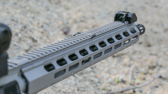 The M400 Elite has the same cold-hammer-forged, 1-in-7-inch-twist barrel found on other 5.56mm NATO Sig rifles. The barrel floats freely inside an ultra-light M-LOK handguard with Sig’s own Micro-Light gas block, which is extremely low profile and makes for a very soft-shooting carbine.