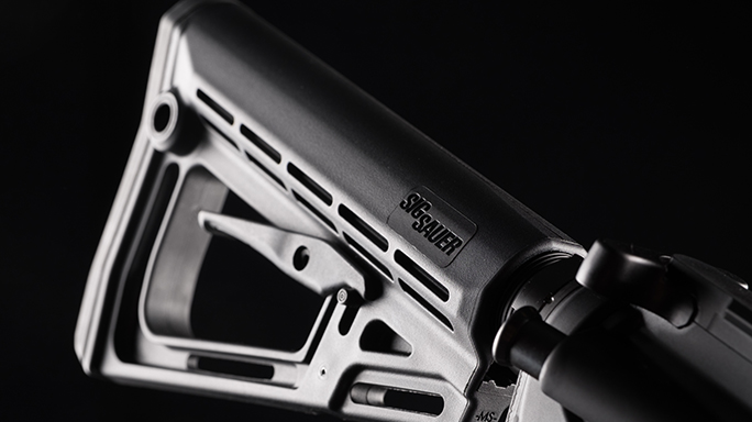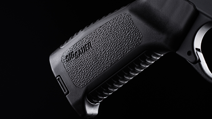 Lastly, Sig’s engineers addressed the pistol grip with a very useful design. It is comfortable like many others, but it’s ahead of many of them with a carefully designed internal compartment that can hold spare batteries or components.