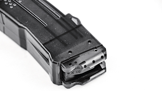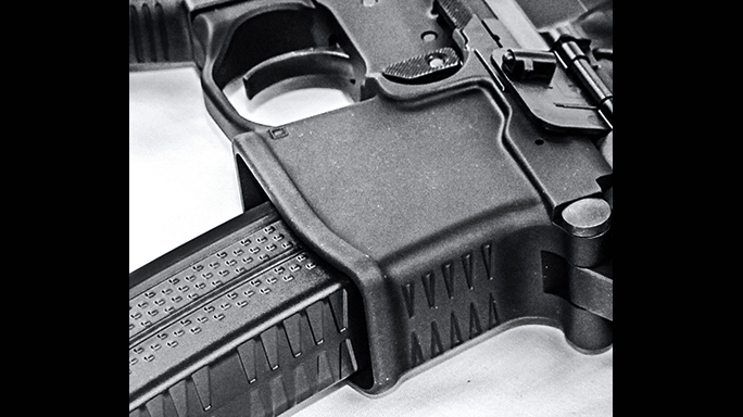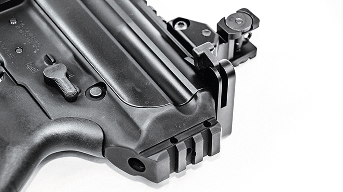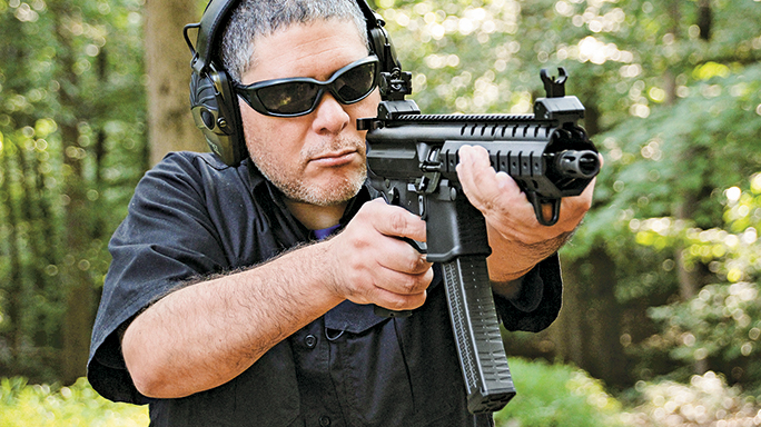 The trigger is an AR-type, single-stage unit, but my test gun’s seemed a bit on the heavy side at about 7.5 pounds. But then again, this was not designed as a target trigger but rather a submachine gun trigger. The integral triggerguard has also been enlarged to accommodate shooting while wearing gloves.