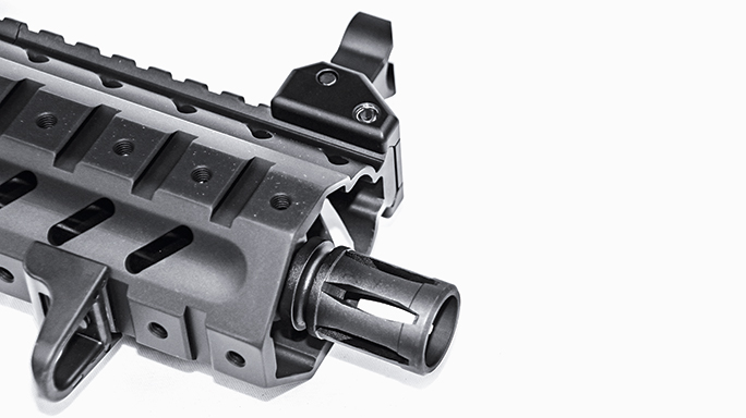 That same Torx wrench can also be used to easily and quickly remove the barrel/gas piston assembly, giving the user a choice of installing a 4.5-, 6.5- or 8-inch (included here) barrel. With the 8-inch barrel and handguard, only the A1 style flash suppressor is exposed, and there is a full 14 inches of uninterrupted Picatinny rail space for optics. The threaded barrel is also suppressor ready. My test model came with a handguard drilled and tapped for adding side and bottom rails, but carbon-fiber and KeyMod versions are also available.