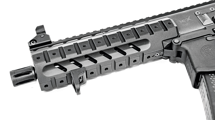 The upper and lower receivers are both made from extruded aluminum so that, despite its size, it is surprisingly lightweight. The MPX platform is also incredibly modular. With nothing but an Torx wrench, the 8-inch aluminum handguard on my test MPX-P can be removed and replaced with other options. It should be noted that the upper receiver is monolithic and that the interchangeable portion of the handguard only consists of the bottom portion under the barrel and a short portion above and to the front. This system also allows the barrel to remain free-floating for improved accuracy.