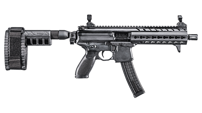The horizontal indentations at the rear of the upper receiver are designed to accept a fully collapsible stock. Fixed or folding stocks are also available for anyone who wants to register the pistol as a short-barreled rifle, or SBR. Another option is installing a Sig Sauer SBX stabilizing brace to offer greater stability while shooting. I have tested this system previously with a folding stabilizing brace, and it significantly increases both shooter comfort and ease of aiming.