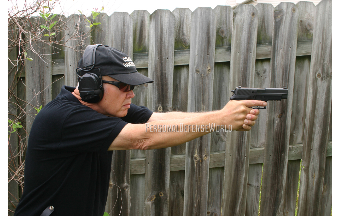 I then ran the Sig P227 through a 30-round practical pistol course on an old-fashioned K-zone humanoid target, at one time the standard for LE use. My magazines were loaded with a mix of the .45 ACP test cartridges, and I inserted one in the P227, doing a “lock and load,” and then holstering. Two spare magazines went into the left outer pocket of my cargo shorts. I engaged the target at 3 yards, firing six rounds strong-hand only and six support-hand only, with a magazine change. I used a point-shoulder stance with my support arm angled across my chest for additional protection.
