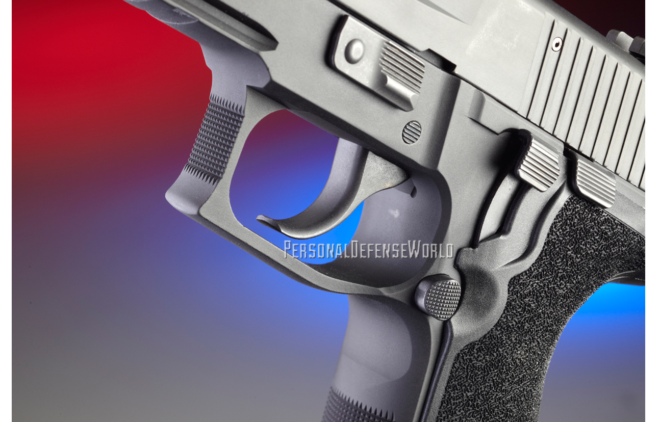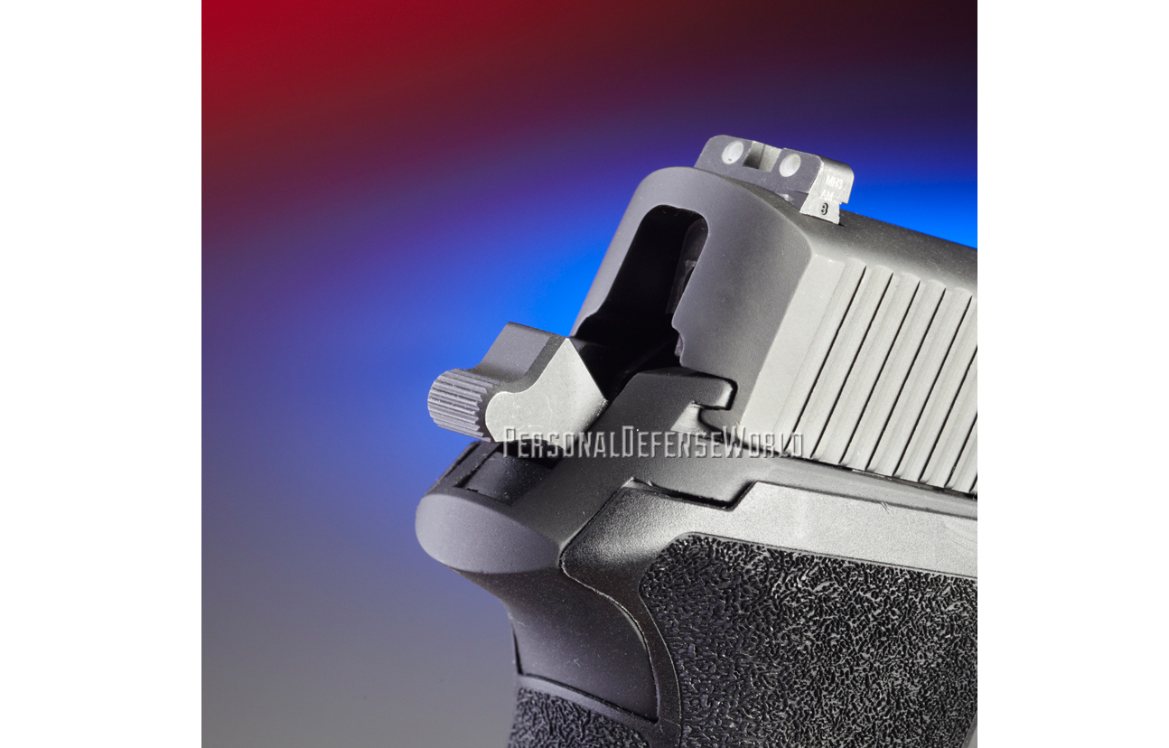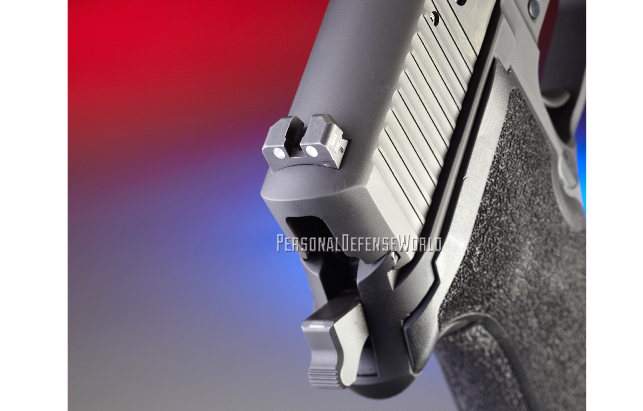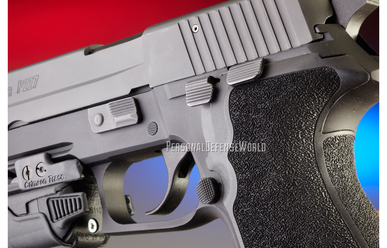 The P227 has the customary Sig Sauer control configuration platform, with the takedown latch on the receiver, just above the trigger. As you move backwards, you’ll next find the decocking lever and, immediately behind it, the slide release lever. An inch below the decocker is the magazine catch. There is no external manual safety, but the P227 features Sig’s Four-Point safety system, which incorporates the decocking lever, patented automatic firing-pin block safety, safety intercept notch and trigger bar disconnector.