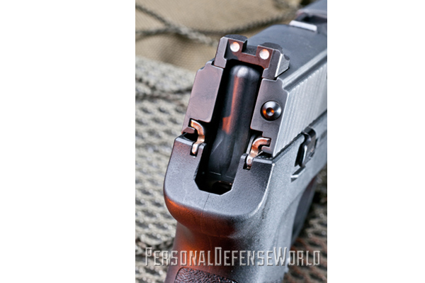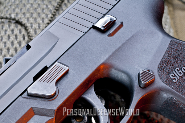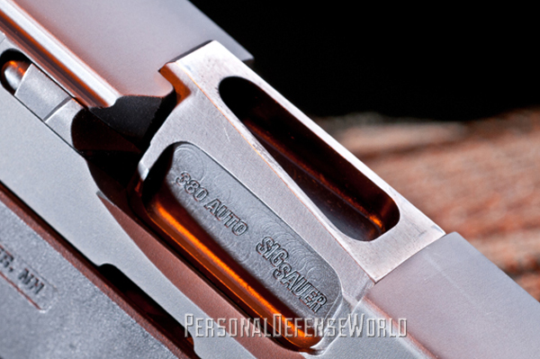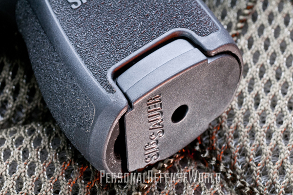 Atop the slide are Sig’s outstanding three-dot SigLite night sights. These are dovetailed into the slide and are drift adjustable for windage. While unobtrusive, they are high-profile enough to acquire a real sight picture and offer excellent sighting capabilities. They also glow very brightly in low-light conditions, allowing for accurate targeting even in less than ideal conditions. It is truly a pleasure to have a micro-compact pistol with real sights, which add to user comfort and confidence.