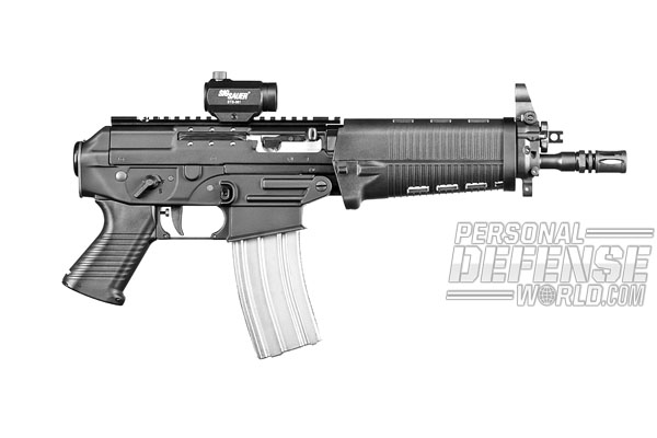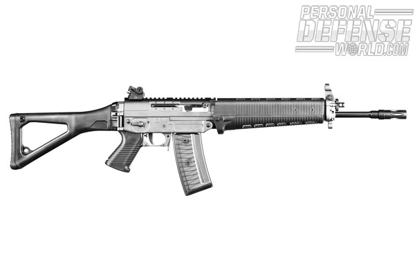The SIG556 was built in the U.S. and is available to the general consumer. Offered in several variations, the SIG556 retains the series’ legendary reliability while being compatible with AR magazines. This has given the rifle a versatility that simply cannot be matched. It retains the full-length gas system with the two-position gas valve, and the SIG556 SWAT Classic model features a railed forend and a 1-pound reduction in overall weight.