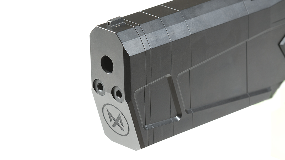 The most striking difference between the Maxim 9 and a traditional handgun with a mounted suppressor is its size and shape. The Maxim 9’s integrated baffle system sits in front of the barrel and the baffle chambers extend downward, below the frame. Rather than the typical round design, the Maxim 9’s baffle chambers are rectangular with most of the baffle below the barrel. Not only is the resulting suppressor length approximately half that of traditional units, but the weight and center of gravity shifts dramatically backward toward the shooter, making the Maxim easier to control in regard to both recoil and over-swing when shooting multiple targets.