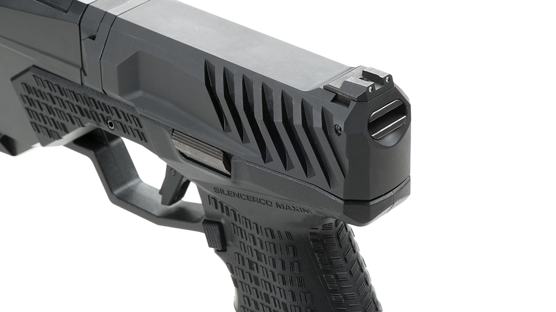 The Maxim 9’s sights are set up in a three-dot configuration with tritium for night use. The rear sight can be swapped for any that fit a Glock. However, SilencerCo recommends that the front sight not be changed. It was specifically designed to withstand the high level of heat generated at the suppressor’s end. Aftermarket sights that SilencerCo tested either melted or their inserts fell out.